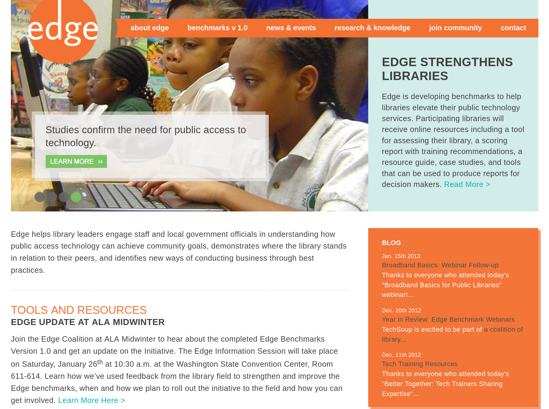 Created platform to support survey for library computer policy.Related to Impact Survey project. URL https://web.archive.org/web/20130120164344/http://www.libraryedge.org/ Screenshot Image Client Library Edge Employer Forum One Year start 2013